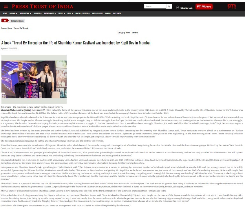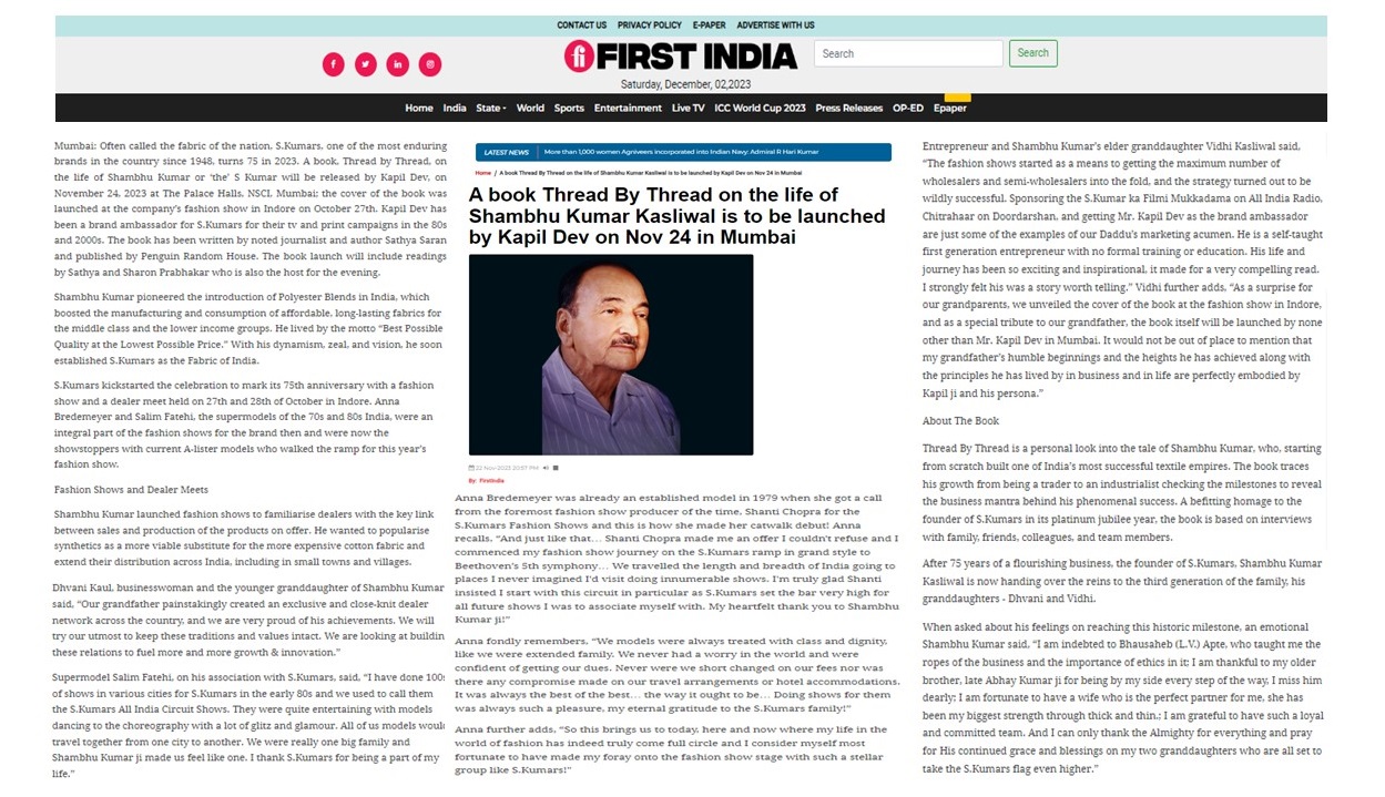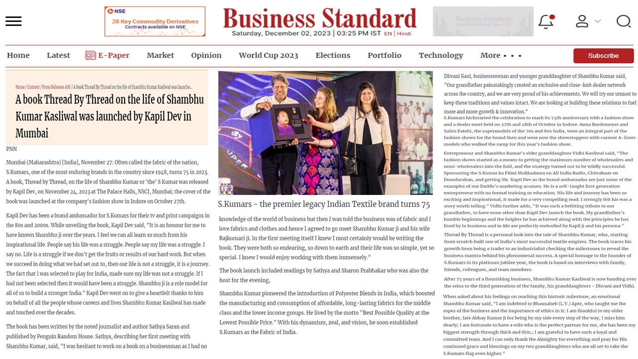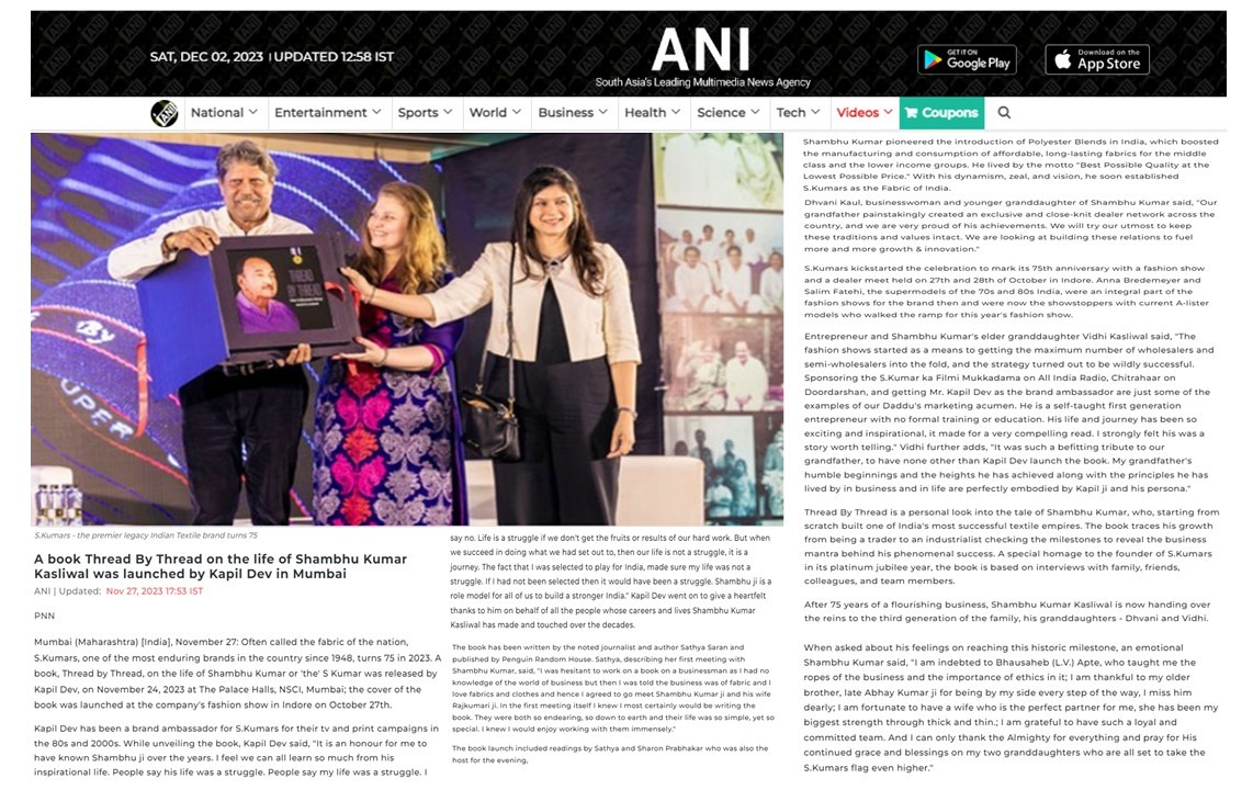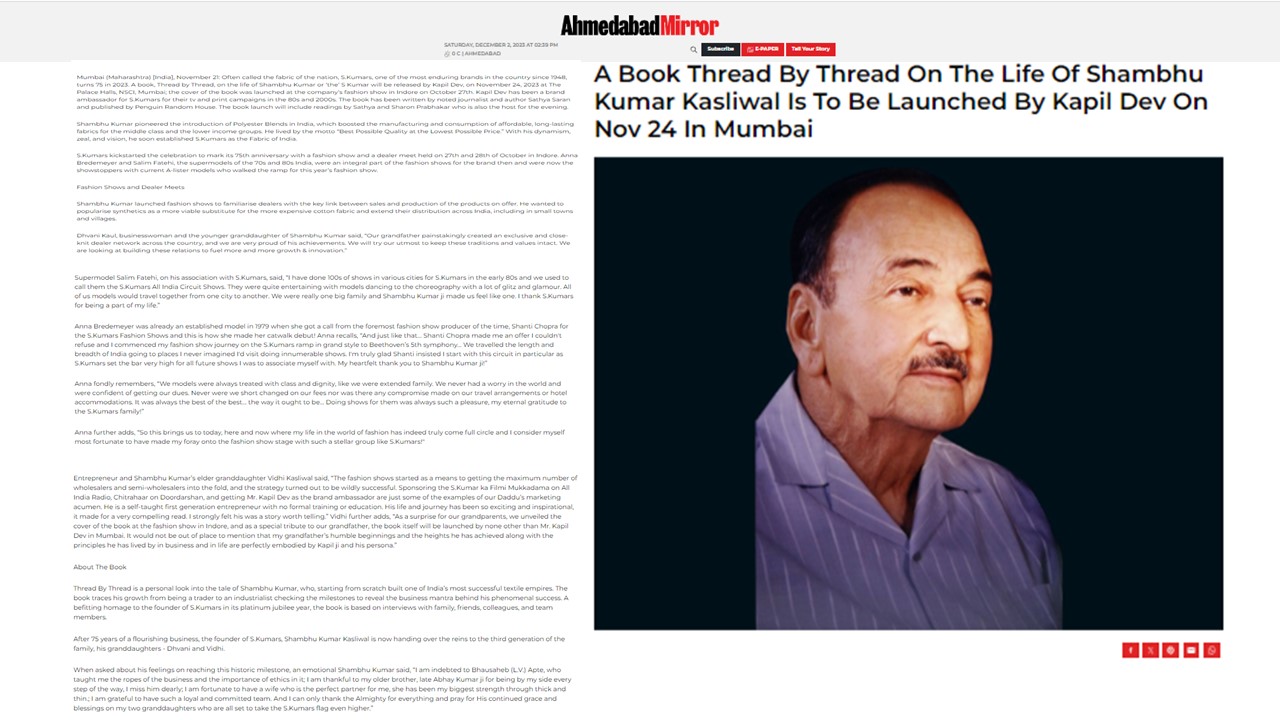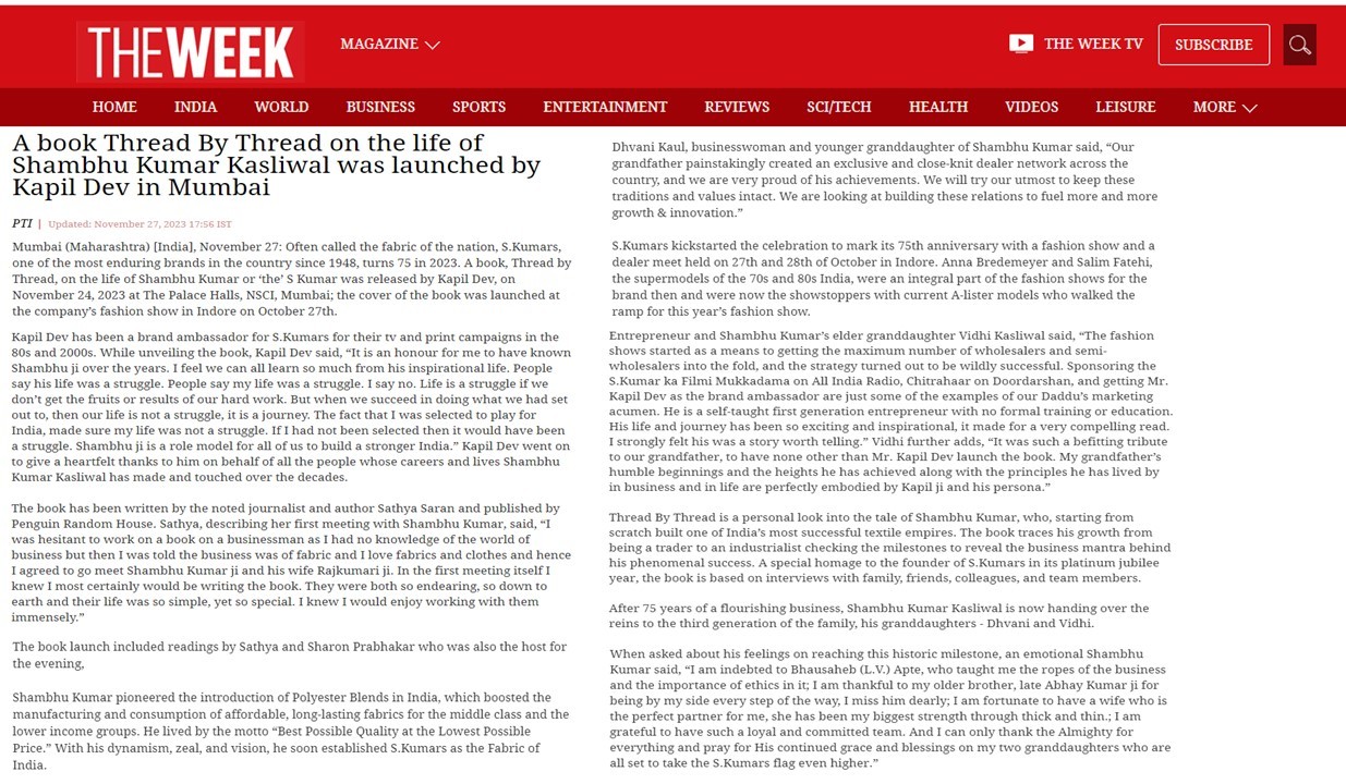 Textile World Newspaper article in Special Manufactures Supplement about S.Kumars.