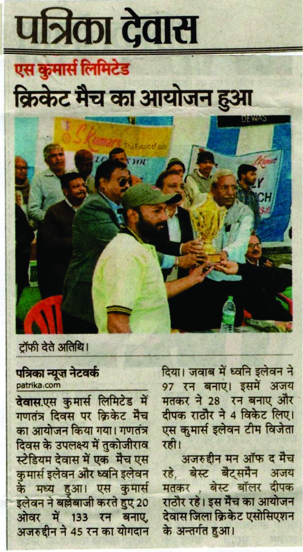 A Cricket Match Organized By S.Kumars Limited on India’s 70th Republic Day covered By Patrika Newspaper, Dewas.
